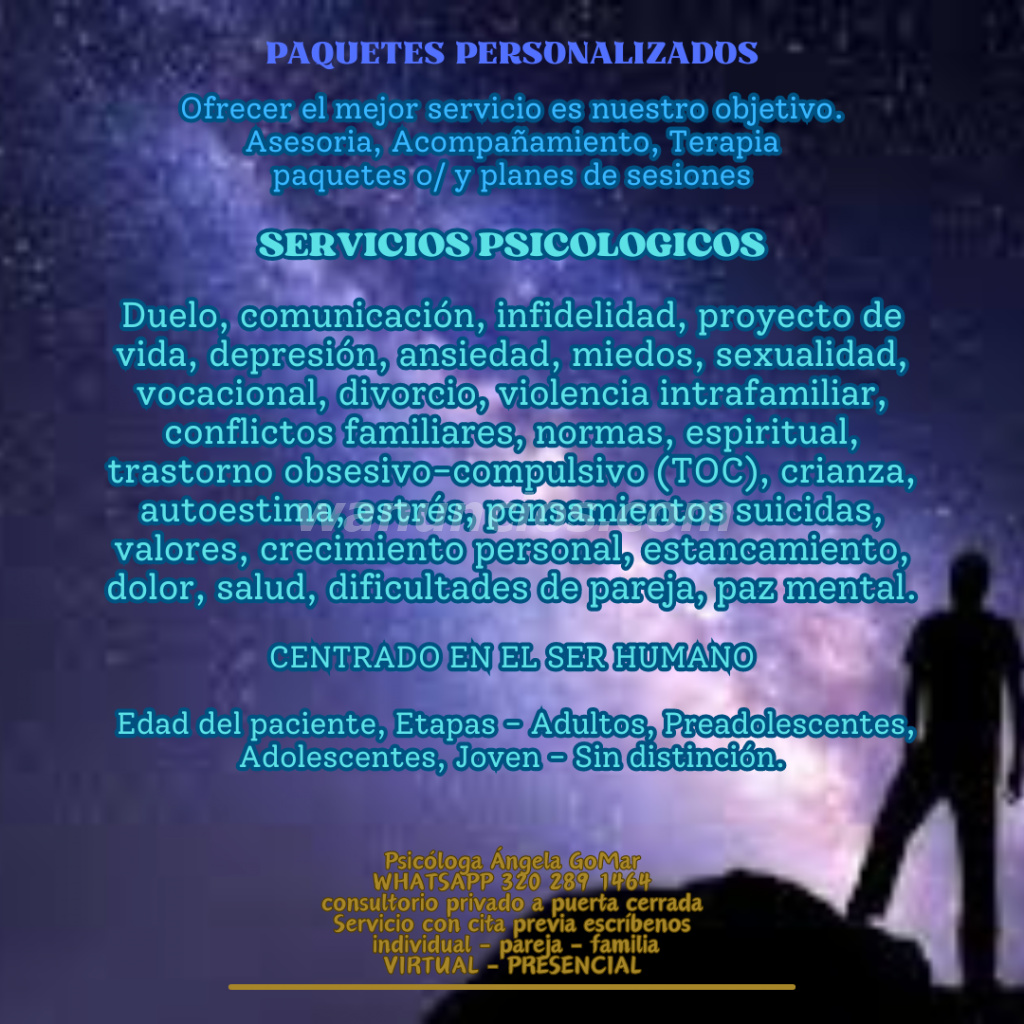 Oportunidad para reconectar contigo mismo, comprender tus emociones, trabajar en ti para evolucionar a tu mejor version en todos los ambitos de la vida. familia, individual, pareja, laboral, social o aprender a manejar temas como la depresion, ansiedad, TOC, autoconcepto, pensamientos, comportamientos, decisiones, limites, proyecto de vida, duelo entre otras cosas o tomar e tiempo para hablar de tus temas importantes y encontrar otras formas de ver la vida.