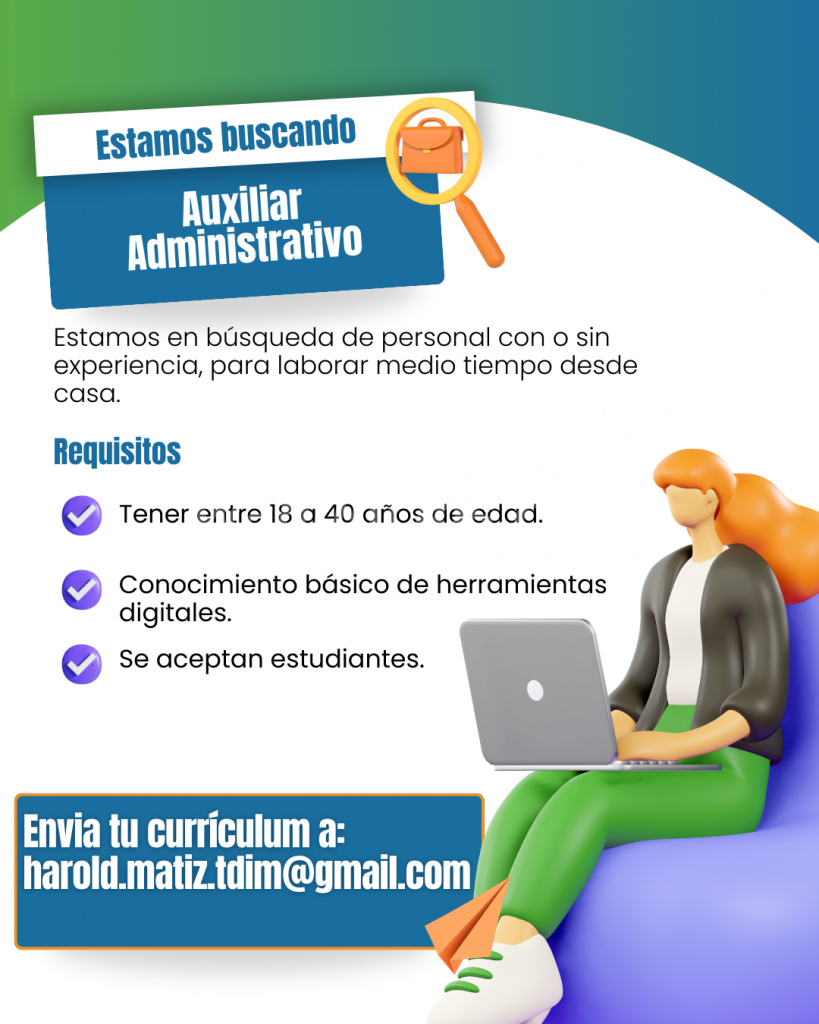 Buscas crecimiento y un ambiente laboral agradable? Empresa en expansión está seleccionando personal comprometido, proactivo y con deseos de superación para fortalecer su equipo de trabajo. Principales responsabilidades: Apoyar en tareas administrativas y de gestión interna. Registrar y actualizar información en bases de datos. Coordinar citas, controles y reportes semanales. Colaborar en la elaboración de material publicitario y seguimiento de actividades del área. Lo que ofrecemos: Ingresos aproximados: Entre $750.000 y $1.050.000, más bonificaciones por desempeño. Horario: Medio tiempo, de lunes a viernes, con flexibilidad horaria. Tipo de contrato: Indefinido, directamente con la empresa. Modalidad: Presencial o teletrabajo (si cuentas con equipo e Internet). Ambiente laboral: Profesional, colaborativo y con posibilidad de desarrollo personal y profesional. Requisitos: Edad entre 18 y 40 años. Bachiller culminado o mínimo noveno grado aprobado. No se requiere experiencia previa. Conocimientos básicos en herramientas digitales y ofimáticas. Documentación vigente en caso de ser extranjero. Te interesa formar parte de nuestro equipo? Envía tu hoja de vida al correo: [email protected] Da el primer paso hacia tu crecimiento profesional!